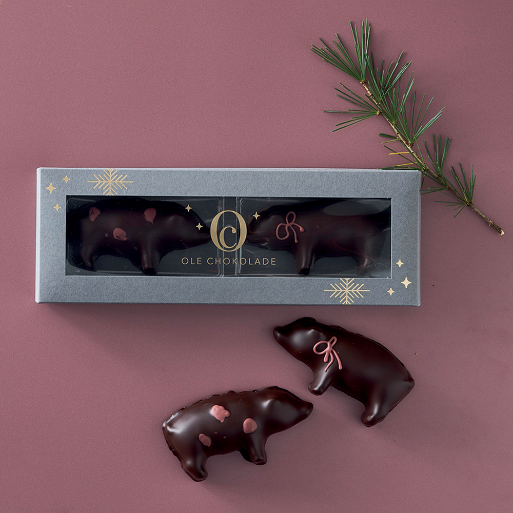 En flot gaveæske med 2 stk. marcipangrise. Perfekt som mandelgave, værtindegave eller blot en sød hilsen.