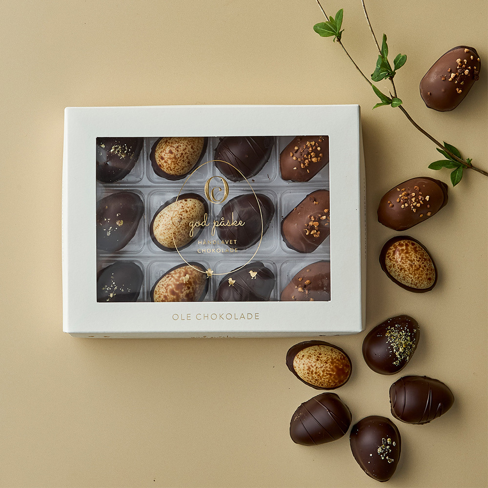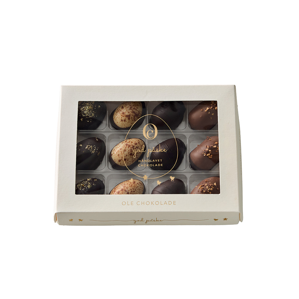 Gaveæsken indeholder 12 mesteræg af 4 forskellige smagsvarianter.